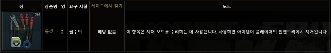 도구 세트 를 잃어버릴 위험 없이 이 퀘스트를 수행하려면 보안 컨테이너에 도구 세트 하나만 가지고 두 개의 공장 급습을 수행하여 각 급습마다 한 세트씩 배치하십시오. 이렇게 하면 당신이 죽더라도 그들을 잃지 않을 것입니다.
